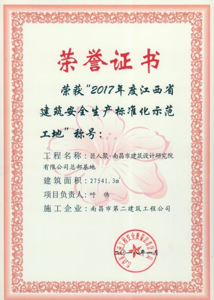 公司承建的郭家莊地塊棚戶區改造項目(安置房)工程、匠人聚.南昌市建筑設計研究院有限公司總部基地榮獲2017年度江西省建筑安全生產標準化示范工地稱號。